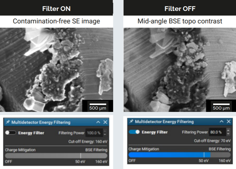 Enhance contrast at electrode interfaces and identify binder and conductive additive distribution across complex layers with three-angle or energy-filtered BSE detection.
