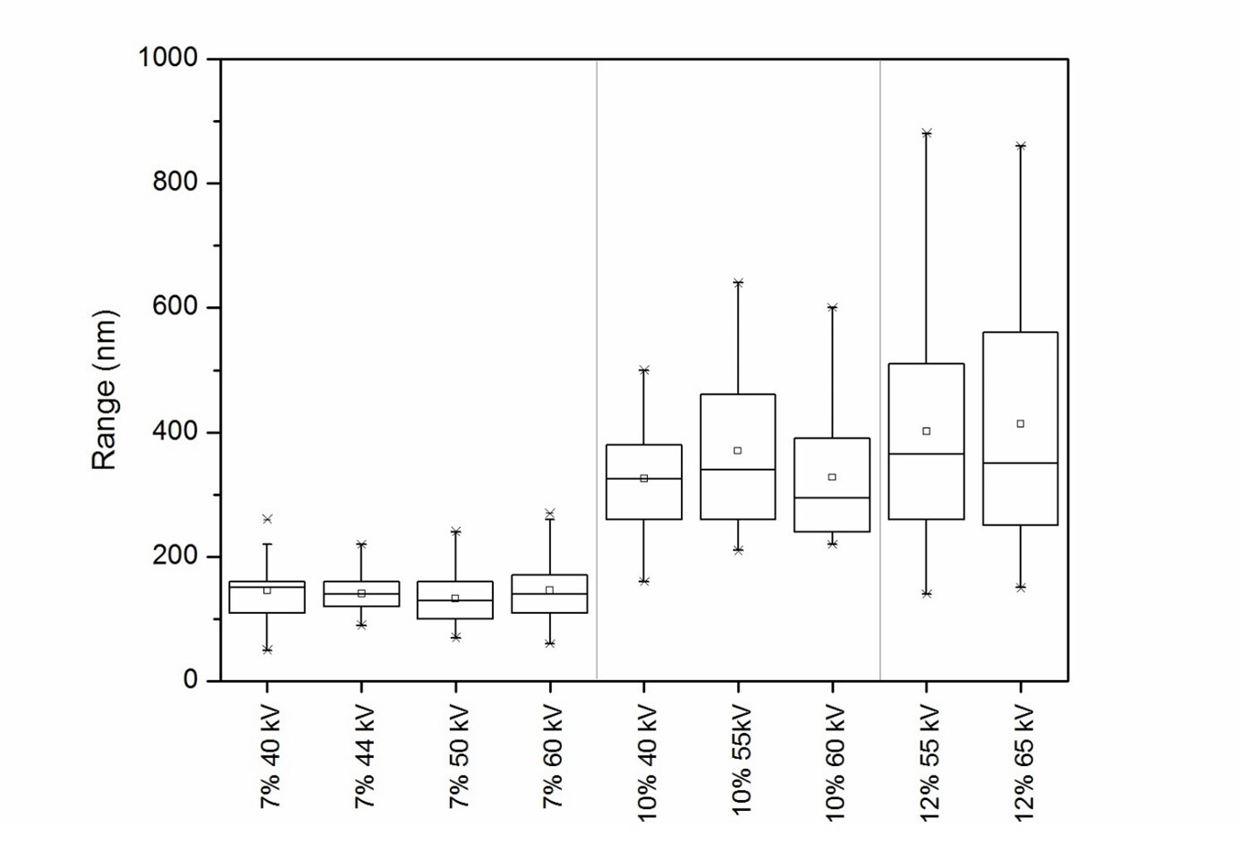 Fibers were fabricated with different combinations of polymer concentration and applied voltage. Each sample was imaged at high magnification (5 µm field of view) under beam conditions optimized for low-Z materials. No conductive coating or destructive sample prep was required.