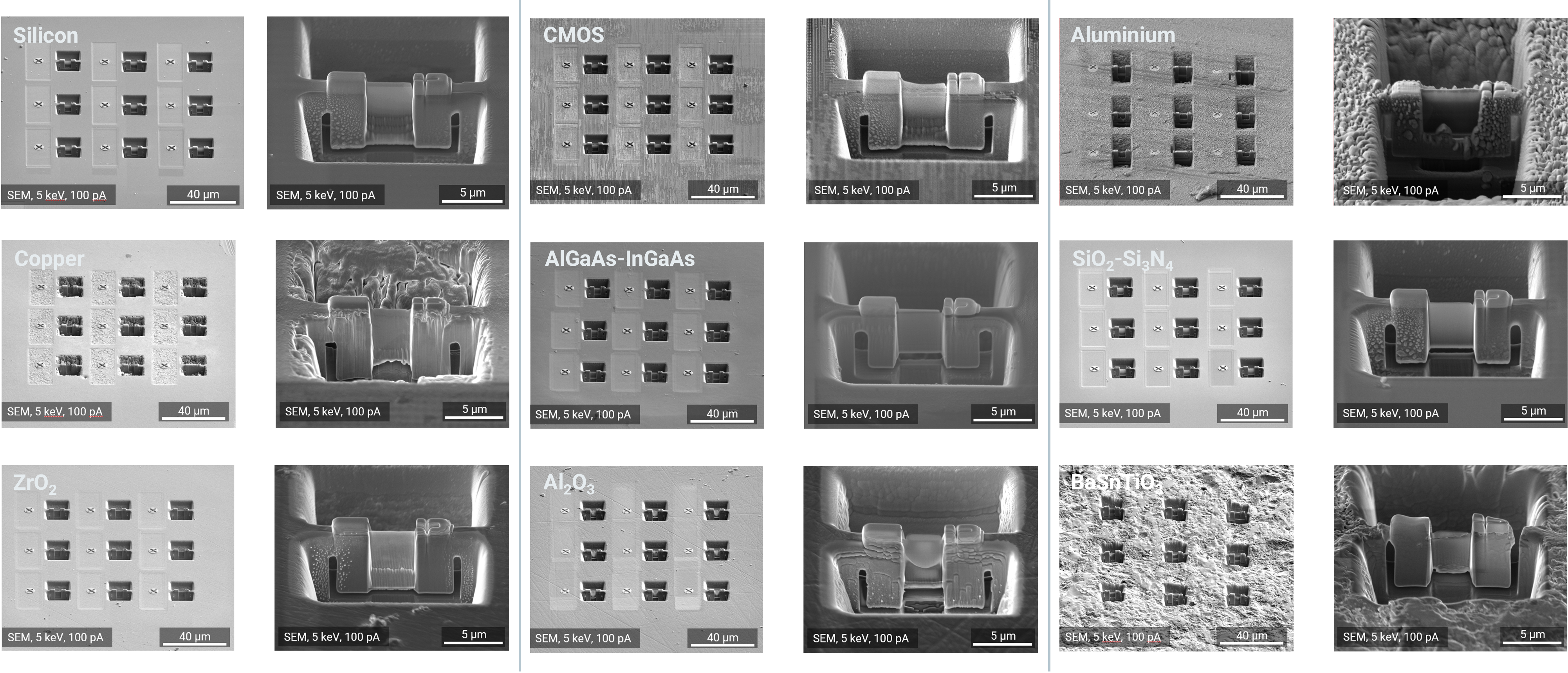 Aluminum, copper, ceramics (ZrO₂, Al₂O₃), and multilayer semiconductors were selected to demonstrate automated TEM lamella preparation. Regions of interest were identified using high-resolution SEM imaging for precise targeting of structural features.