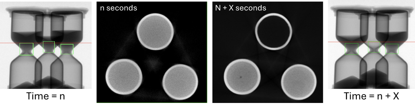 Figure 1: Central images: Real-time reconstructions through the center line of three hourglasses. At T = n, all hourglasses have some sand in their top compartment. The top hourglass is empty in the timestep at n + X seconds. The corresponding radiographs are shown at the outside of the image.