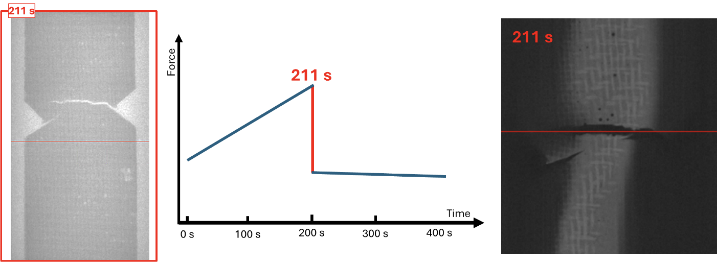 Figure 2: Signal-aided sliding window reconstruction to match the exact moment of the failure of a fiber-reinforced polymer during a tensile test. Left: radiograph, right: virtual cross-section after reconstruction.