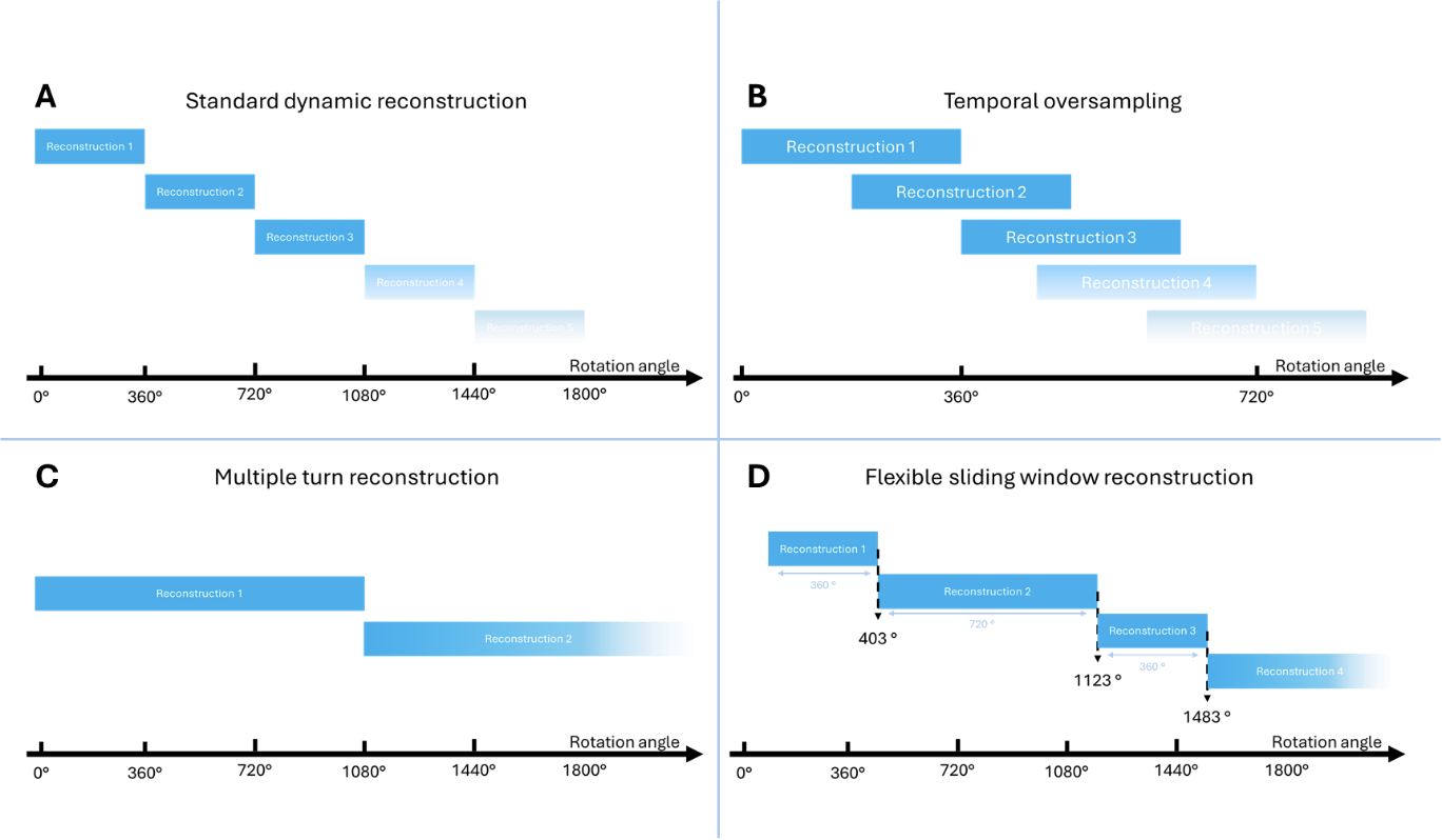 Figure 3: Flexible reconstruction options using the 4D Preview Tool. A: Standard dynamic reconstruction in 360-degree intervals. B: Temporal oversampling at reconstruction intervals less than 360 degrees. C: Grouping multiple turns together to increase image statistics. D: Combination of A and C combined with starting at arbitrary reconstruction angles.