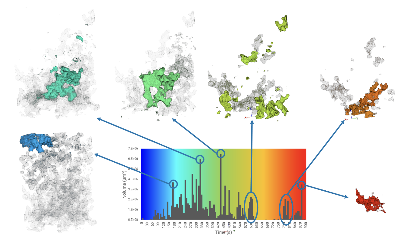 In the final phase, the TESCAN 4D tools within PantheraTM reconstruction and visualization software allow users to process the many hundreds of gigabytes of data acquired in a dynamic CT experiment using straightforward workflows. One of the most significant of these workflows is the so-called flip-point analysis. Using just a few clicks, PantheraTM analyzes the full series of 3D volumes and does a voxel-to-voxel comparison to the local attenuation values. Consequently, it can pinpoint and chronicle the precise moments of changes within a voxel - for example, the transition from an empty pore to a filled pore in a fluid flow experiment, Figure 4) can be tracked and mapped throughout the full duration of the experiment. Subsequently, the segmented, time-mapped data allows for the isolation and sequential examination of individual events.