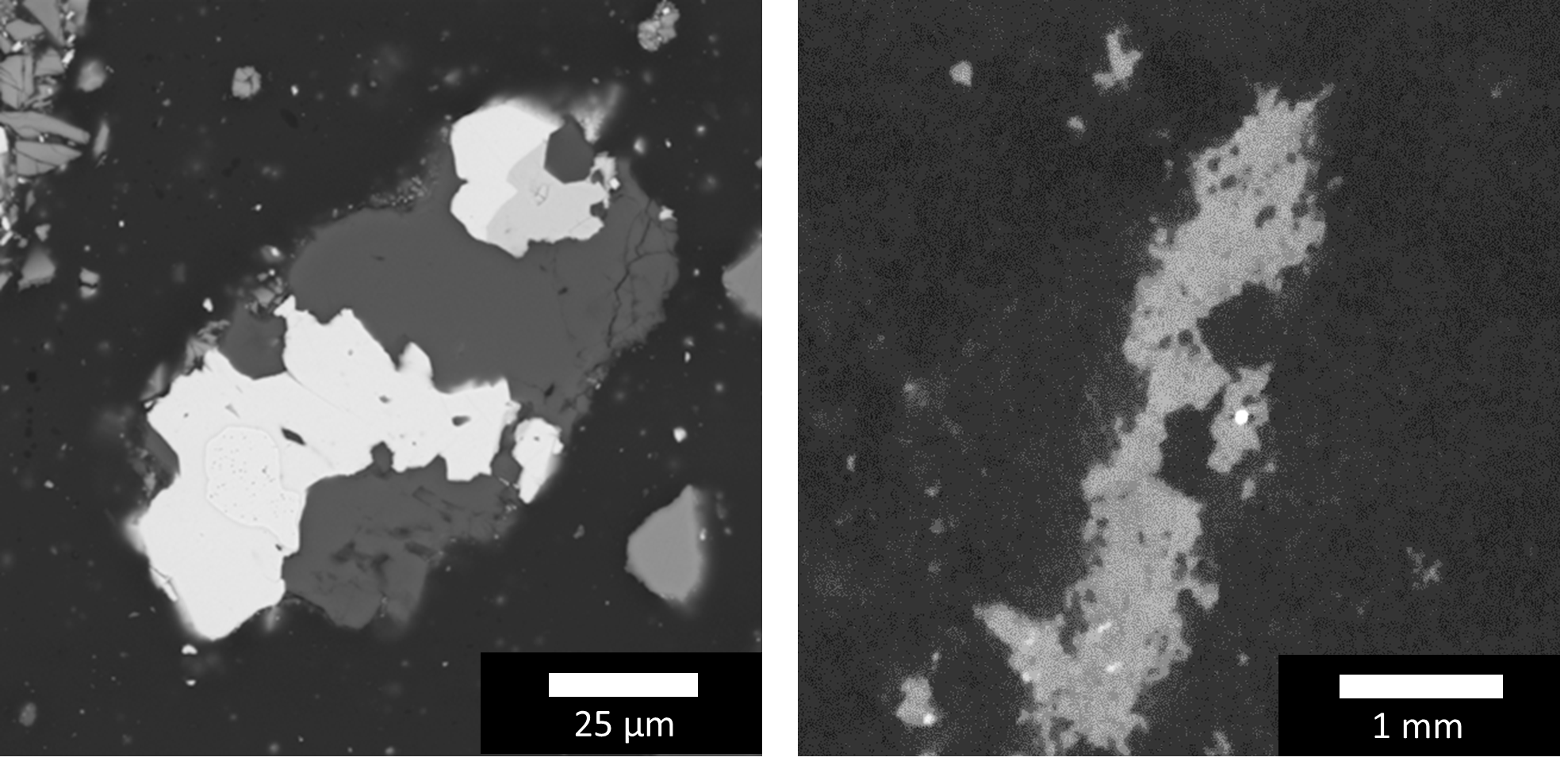 Figure 1. Images showing a similar sample containing gold (bright phase), acquired on an SEM (left) and a micro-CT (right)